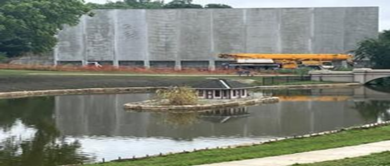 Tiles from the former Pershing Center mural will be affixed to a 350,000-pound concrete wall built north of a recently refurbished pond and bridge on the western edge of Wyuka Cemetery.